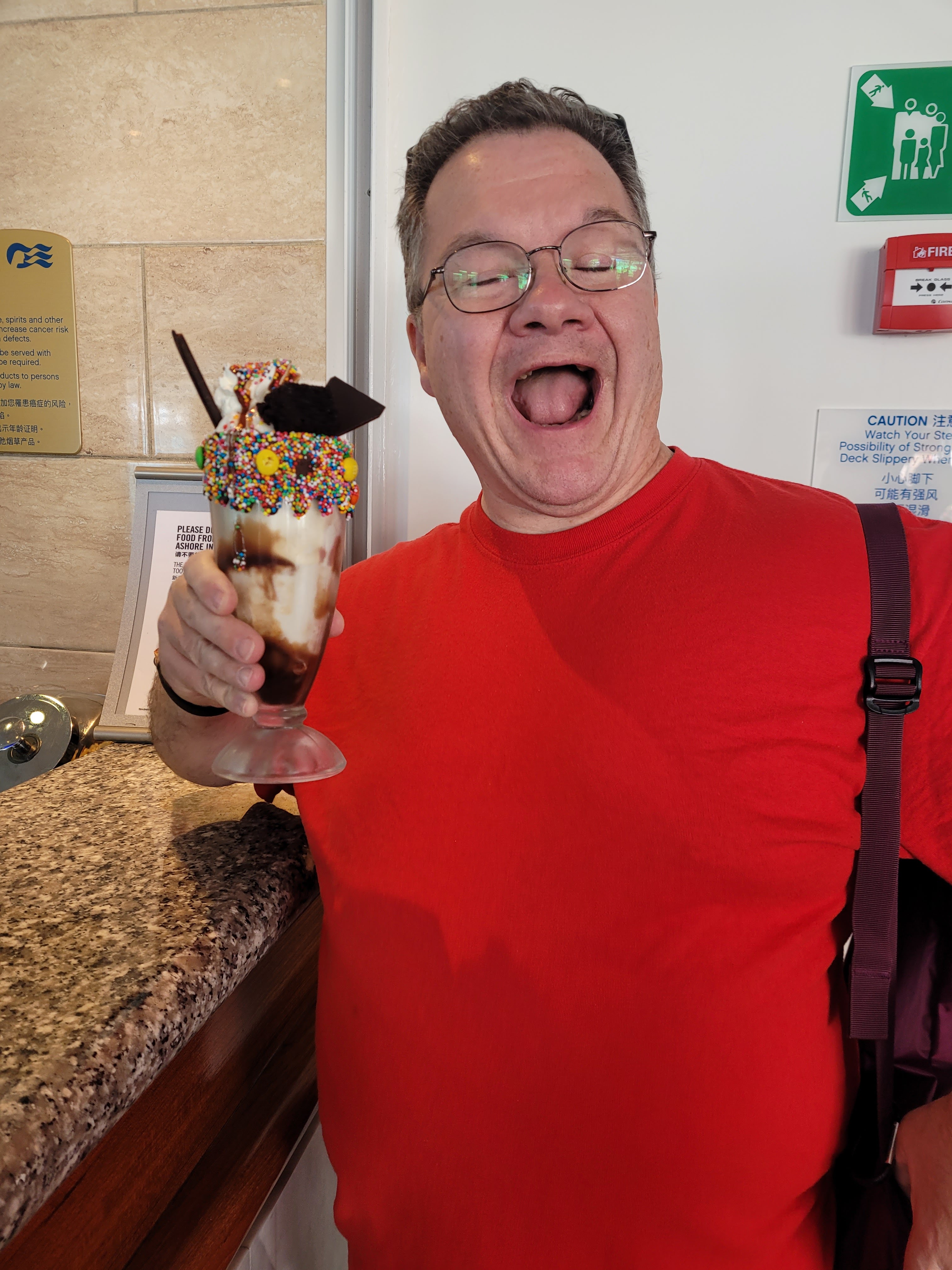 In the meantime, just wanted to post a couple of pictures of our afternoon indulgence today - some yummy ice cream sundaes from the Swirls ice cream counter on Deck 16. We had to pay for these but boy, were they worth it!